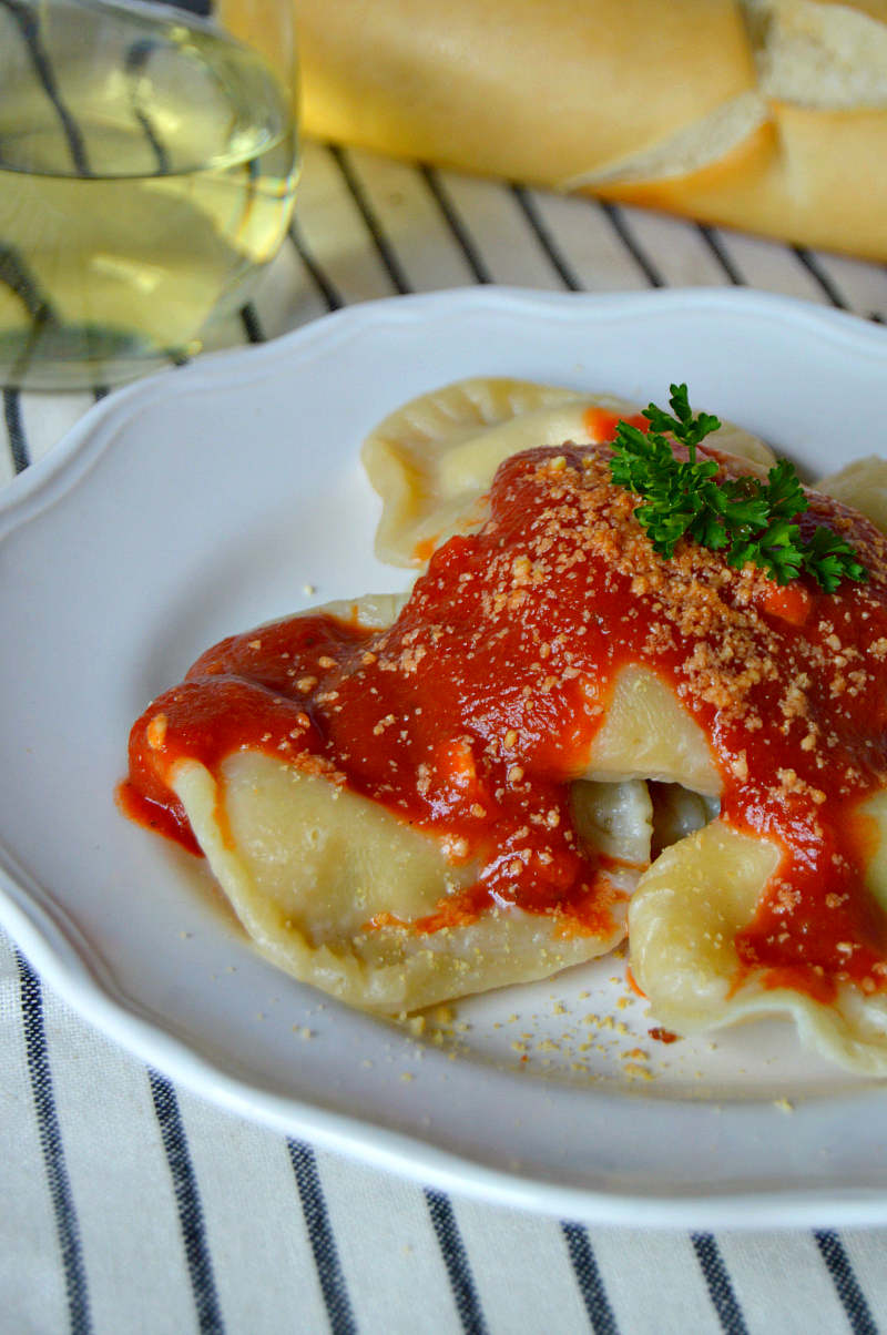 Place ravioli dough into a lightly oiled bowl and place it into the refrigerator. Form the dough into a rectangle and roll it through the pasta machine, 2 or 3. I enjoy mine with a sprinkle of olive oil and a generous sprinkle of grated parmesan.